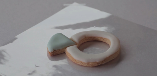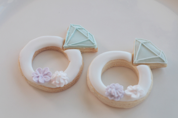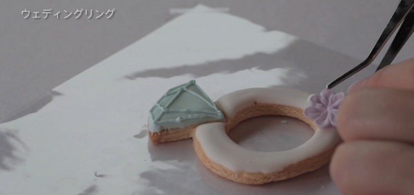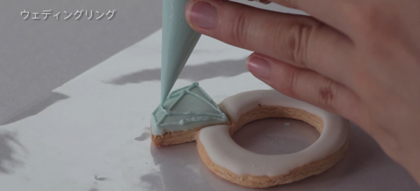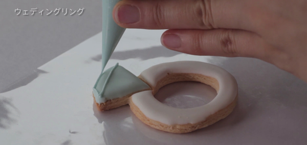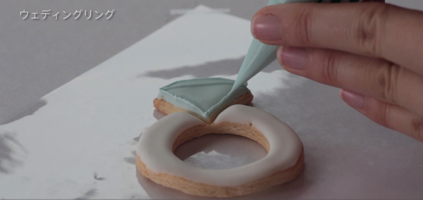 Lesson12-18 ウエディングアイシング・リング 作り方 ①リング型のクッキーにホワイトとティファニーブルーでベースを施し乾燥させます。 ②同じカラーのライン用アイシングを用意しデコレーションしていきます。 リングのジュエリー部分のラインは、最初に真ん中の横ライン、次に上のラインを描いてから、下側のV字、最後にジュエリーの中のラインを描くようにします。 ③最後にお好みの部分にアイシングクリームを絞り出してシュガーフラワーをのせます。完全に乾燥させて完成です。