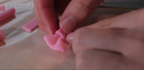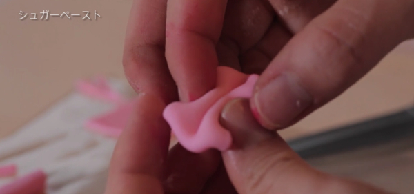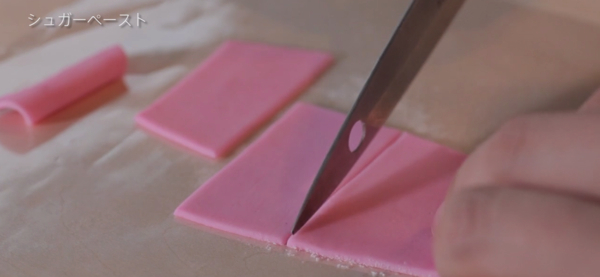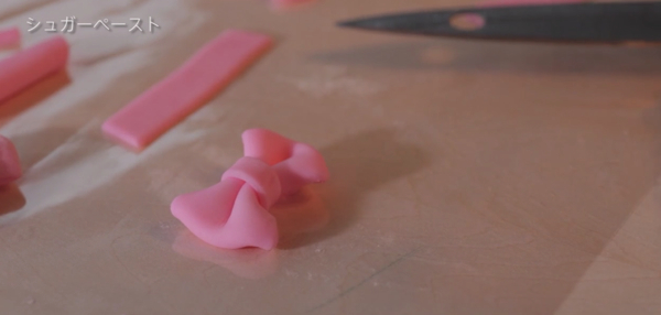 Lesson9-2 シュガーペーストデコレーション1 次は少し難易度をあげてみましょう。 型で抜いたシュガーペーストパーツを立体的に組み立ててリボンをつくります。 ■リボンを作る■ ①シュガーペーストにお好みの色を着色したら、粉糖をまぶしてOPPシートの上に乗せ、めん棒で厚さ1〜1.5㍉程度に伸ばします。 ②ナイフなどで長方形にカットしリボンのパーツを作ります。 ③両端を後ろに織り込み、中央をへこませるようにリボンの形を作ります。 ④細めの長方形をもう一つ作り、リボンの中央に巻きつけて後ろで止めたら完成です。